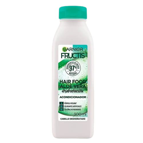 Acondicionador Garnier Fructis Hair Food Aloe Vera de 300ml para hidratar profundamente tu cabello. Con fórmula vegana, biodegradable y hecha con ingredientes 97% de origen natural, sin siliconas, sin parabenos y sin colorantes artificiles. Todos nuestros productos son Cruelty Free. Después del shampoo, aplica de medios a puntas y enjuaga con abundante agua; consiéntete en la semana utilizando la mascarilla Hair Food.Acondicionador Hair Food enriquecido con Manteca de Cacao para cabello rizado y seco. Su fórmula se absorbe instáneamente para desenredar y acondicionar el cabello rápidamente. Tus rizos quedan saludables, intensamente nutridos, con movimiento, sin efecto pesado y libres de frizz.
