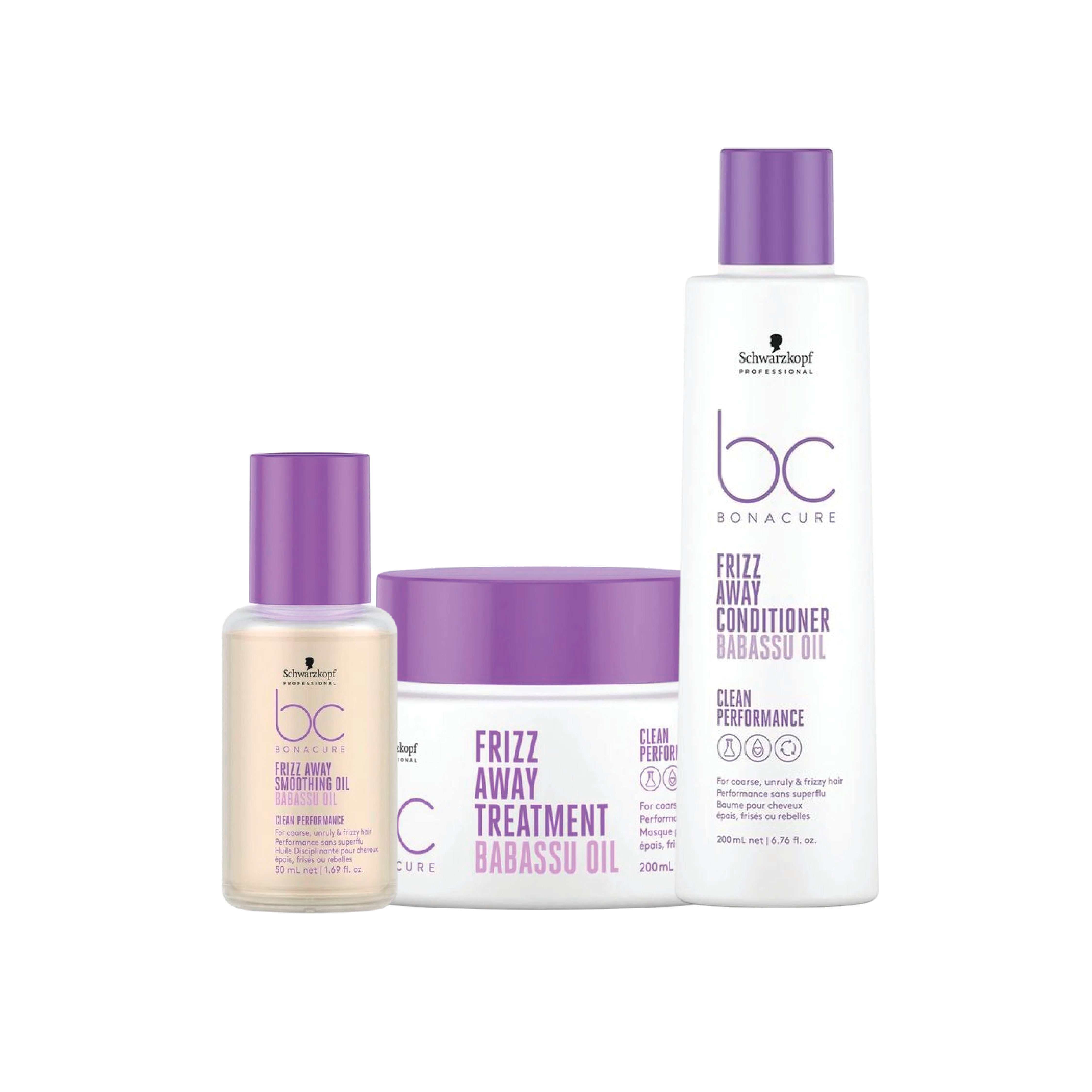 El Bonacure Frizz Away Control Kit combina shampoo, mascarilla y aceite para controlar el frizz, suavizar el cabello y protegerlo de la humedad.