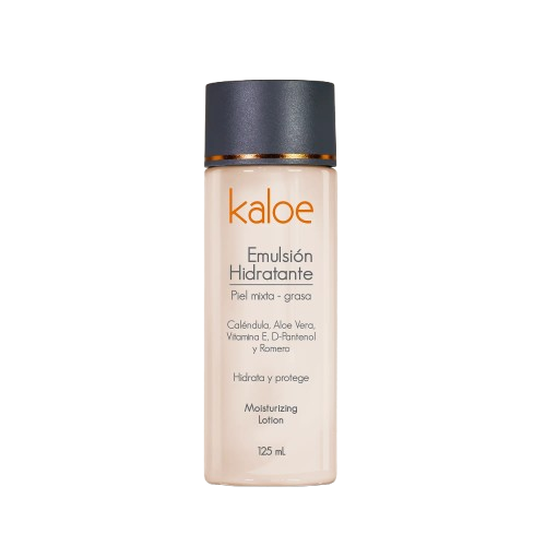 Emulsión Hidratante Kaloe, fórmula ligera que combina activos de origen natural, como Caléndula, Aloe Vera, Vitamina E, D-Pantenol y Romero, los cuales aportan beneficios de hidratación.