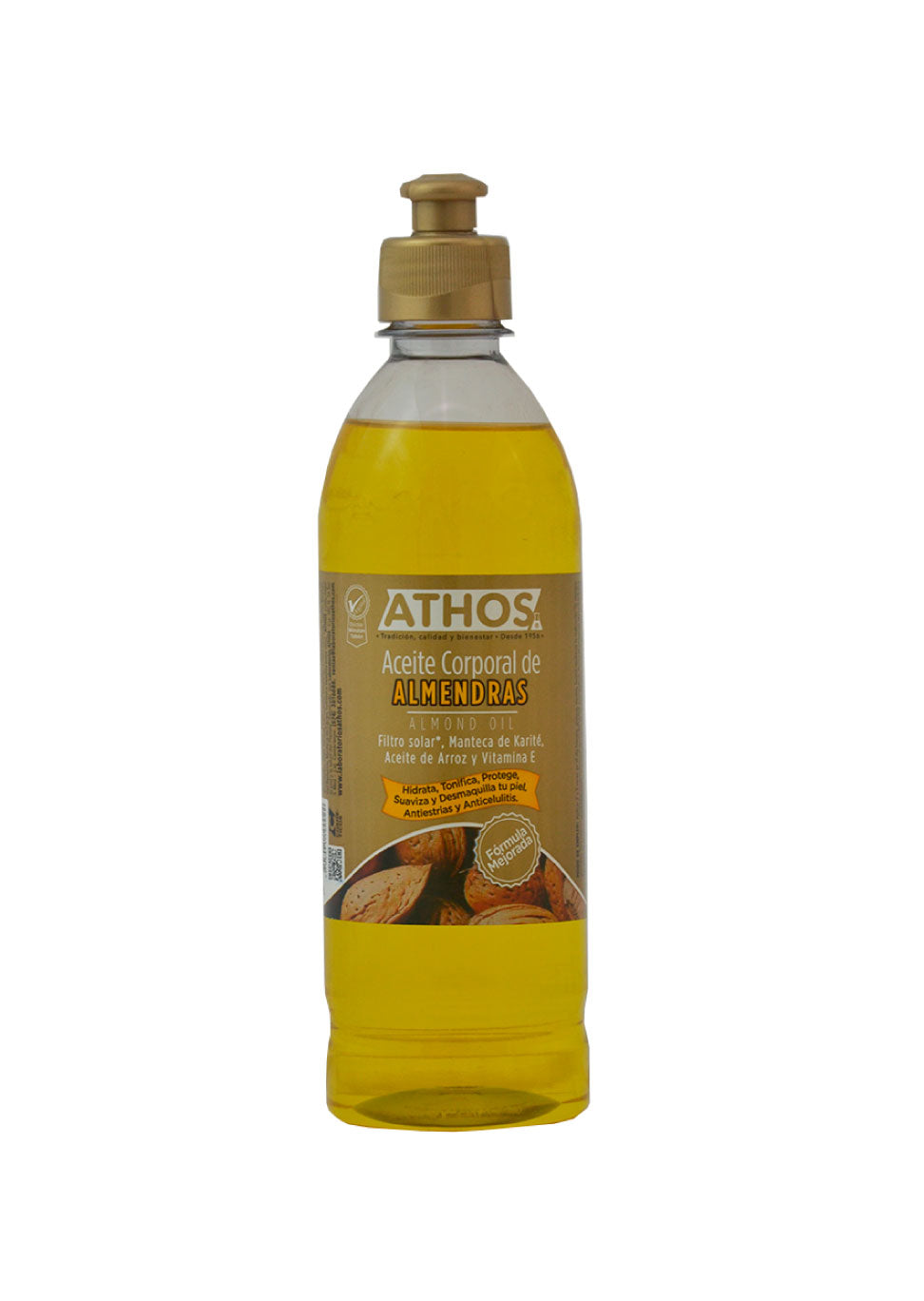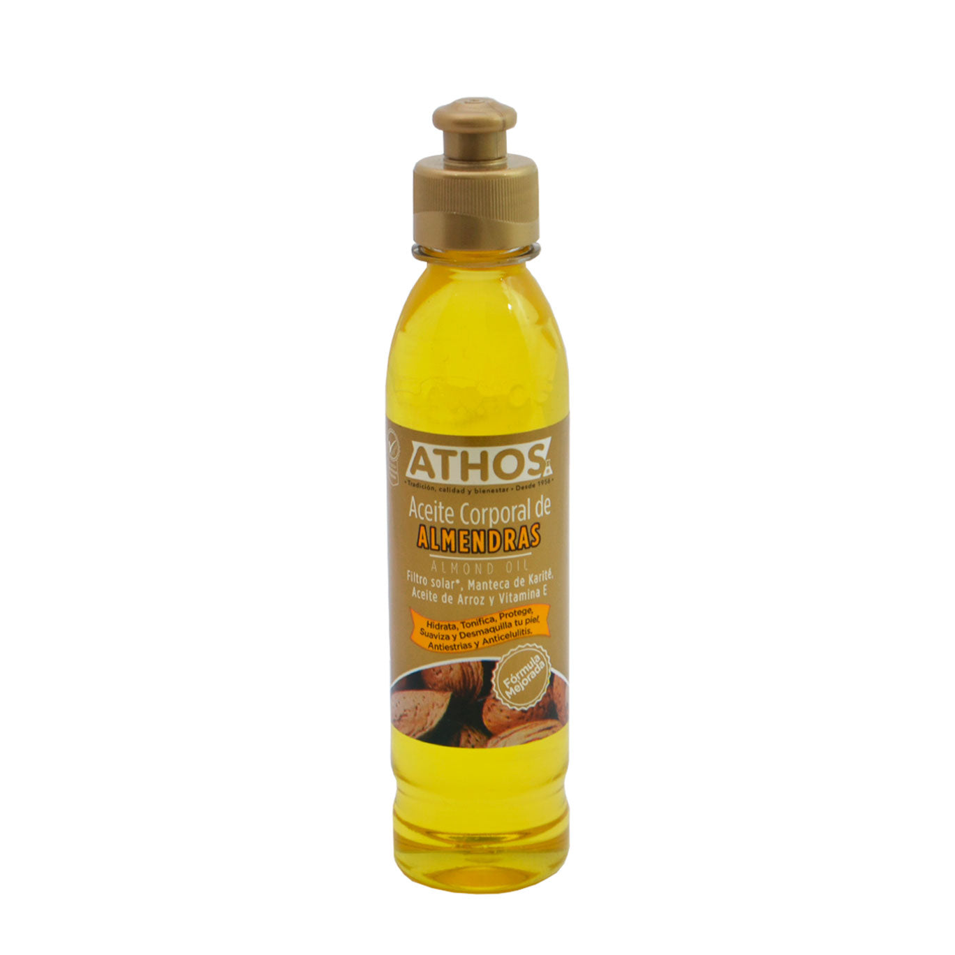 Hidrata, tonifica, protege, suaviza y desmaquilla tu piel. Tiene un alto poder antiestrías y anticelulítico. El aceite de almendras contiene: Filtro Solar, Vitamina E, Manteca de Karité, Aceite de Arroz y Antioxidantes