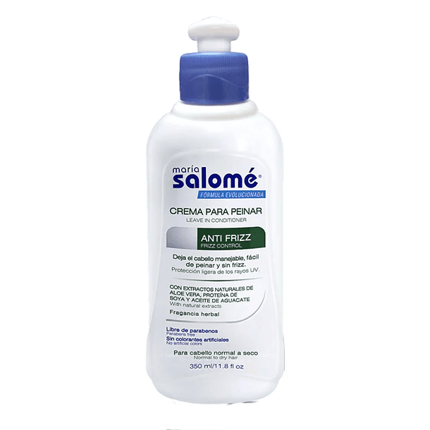 La Crema para Peinar Anti Frizz 350 ml María Salomé trae una fórmula avanzada ha sido diseñada para brindarte un control total del frizz y lograr un cabello más manejable y sedoso. Enriquecida con ingredientes de alta calidad, esta crema para peinar ayuda a combatir el encrespamiento y a dejar tu cabello con un aspecto pulido y brillante.